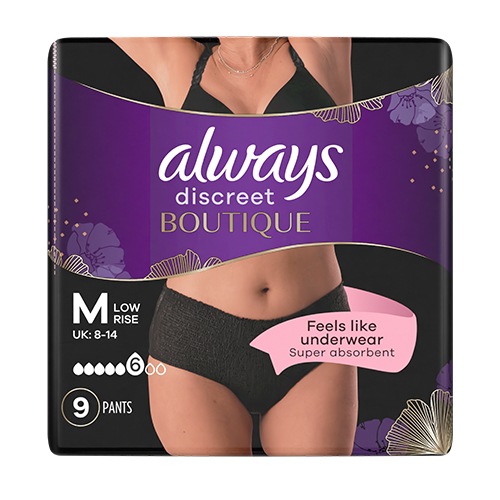 With Always Discreet Boutique Incontinence Pants Black Plus M, bladder weakness doesn’t get in the way of you feeling your best. Discover incredible leak protection that looks like your favourite underwear, thanks to its fabric-like material. Ideal for large amount of bladder leaks, an ultra-thin super absorbent core turns liquid into gel and locks away wetness instantly, so you feel fresh and secure no matter what. With a curve-hugging, feminine design, these pants are made of silky-soft fabric that looks, fits and feels like your usual underwear. Always Always Discreet Boutique Pants let you walk with confidence and make sensitive bladder no big deal. Try Always Discreet Boutique Incontinence Pants Black M. Who said women should have only one style of bladder leaks underwear? Discover Always Discreet Boutique Black Low-Rise Incontinence Underwear.