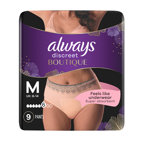 With Always Discreet Boutique Incontinence Pants Beige Plus M, bladder weakness doesn’t get in the way of you feeling your best. Discover incredible leak protection that looks like your favourite underwear, thanks to its fabric-like material. Ideal for large amount of bladder leaks, an ultra-thin super absorbent core turns liquid into gel and locks away wetness instantly, so you feel fresh and secure no matter what. With a curve-hugging, feminine design, these pants are made of silky-soft fabric that looks, fits and feels like your usual underwear. Always Discreet Boutique Pants let you walk with confidence and make sensitive bladder no big deal. Try Always Discreet Boutique Incontinence Pants Beige M. Who said women should have only one style of bladder leaks underwear? Discover Always Discreet Boutique Black Incontinence Underwear