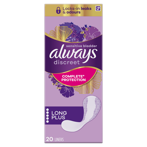 For those times when you need extra protection, there are Always Discreet Incontinence Long Plus Liners for sensitive bladder. These liners are ultra thin and have a flexible core for great comfort. They’re designed to lock away wetness and neutralise odours for added freshness. Try Always Discreet Liners for sensitive bladder for when you experience unintentional frequent urination.