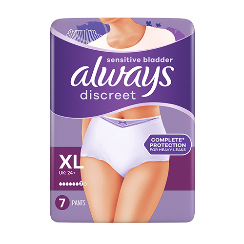 Bladder leaks shouldn’t hold you back. With Always Discreet Incontinence Underwear Plus XL, you can continue with your day as normal, even when you experience large amounts of leaks caused by sudden urges. The super-absorbent underwear is dermatologically tested, soft on skin, and has RapidDry technology to help lock away bladder leaks and odours in seconds. The Double LeakGuards help stop leaks where they happen most. With 360° FormFit shape and a comfortable design core for a smooth and comfortable fit, you’ll be able to walk with confidence. Try Always Discreet Incontinence Underwear Plus XL. Also suitable for post-patrum incontinence. If you are looking for different colours & incredible discretion, choose our Always Discreet Boutique Underwear, available in Black & Beige colours.